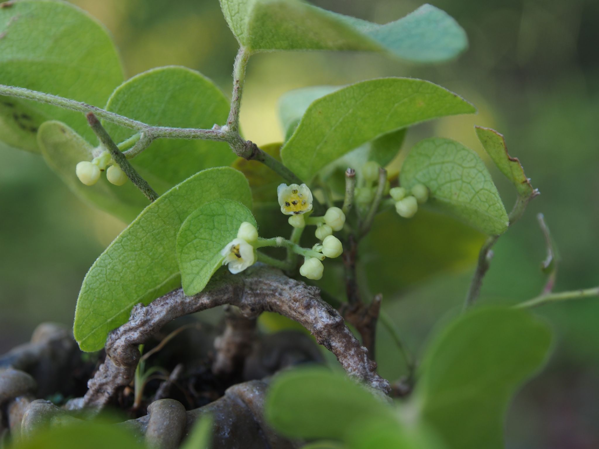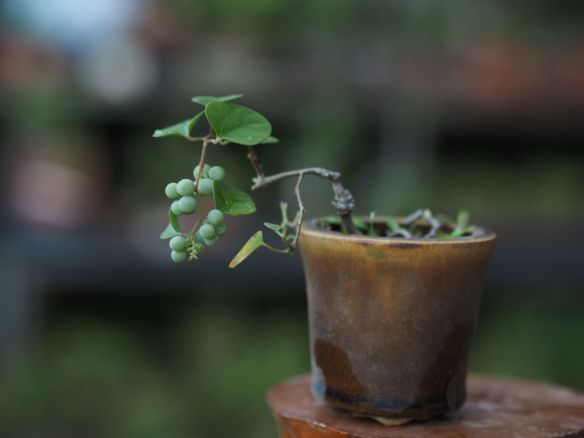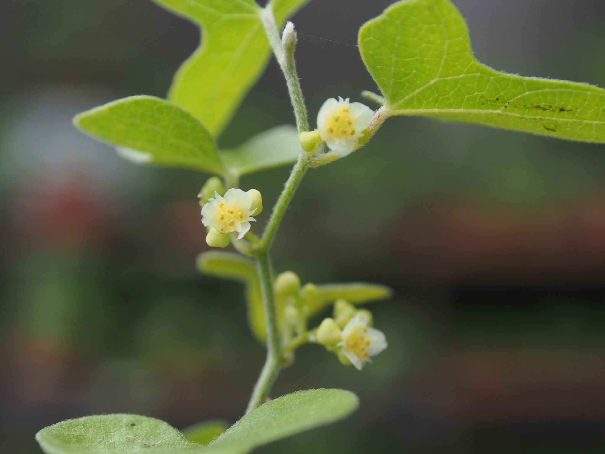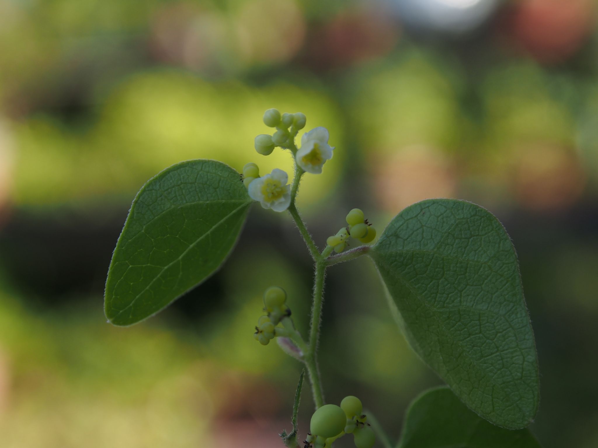 木防己(日文樹名青葛藤),盛夏(7~8月)開花結果,有公株母株之分, 需授粉母株才會結果,掛果期約一個月,果熟後呈藍色,有毒勿食,春季阡插一年枝可活,蔓藤常需修剪,六月前修剪之後放著即會開花,公母株一起放置授粉,很好的豆型盆栽樹種!